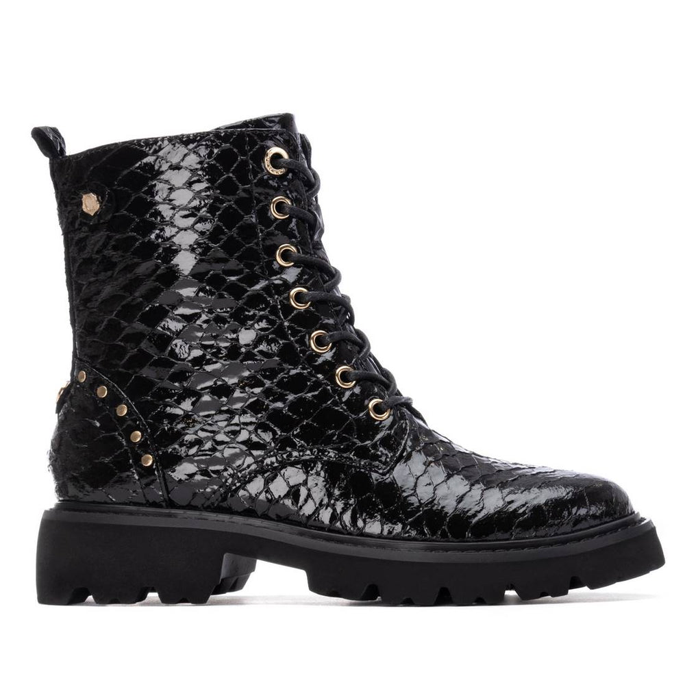 Bota feminina da marca Carmela. Fabricada em material que imita a pele com um bonito padrão animal. Atacadores ajustáveis. Detalhes traseiros com pequenas tachas. Sola grossa de borracha antiderrapante. Palmilha removível.