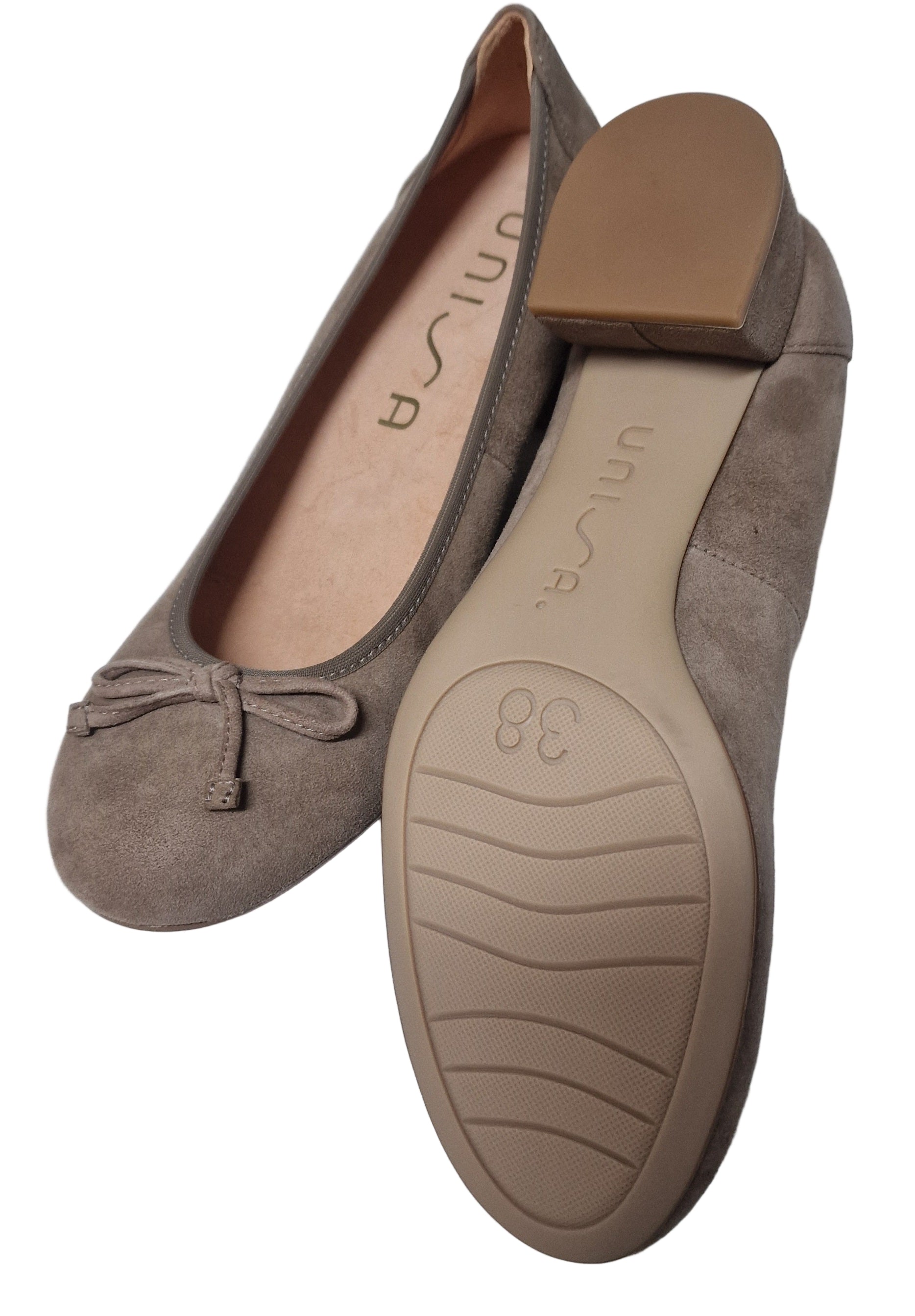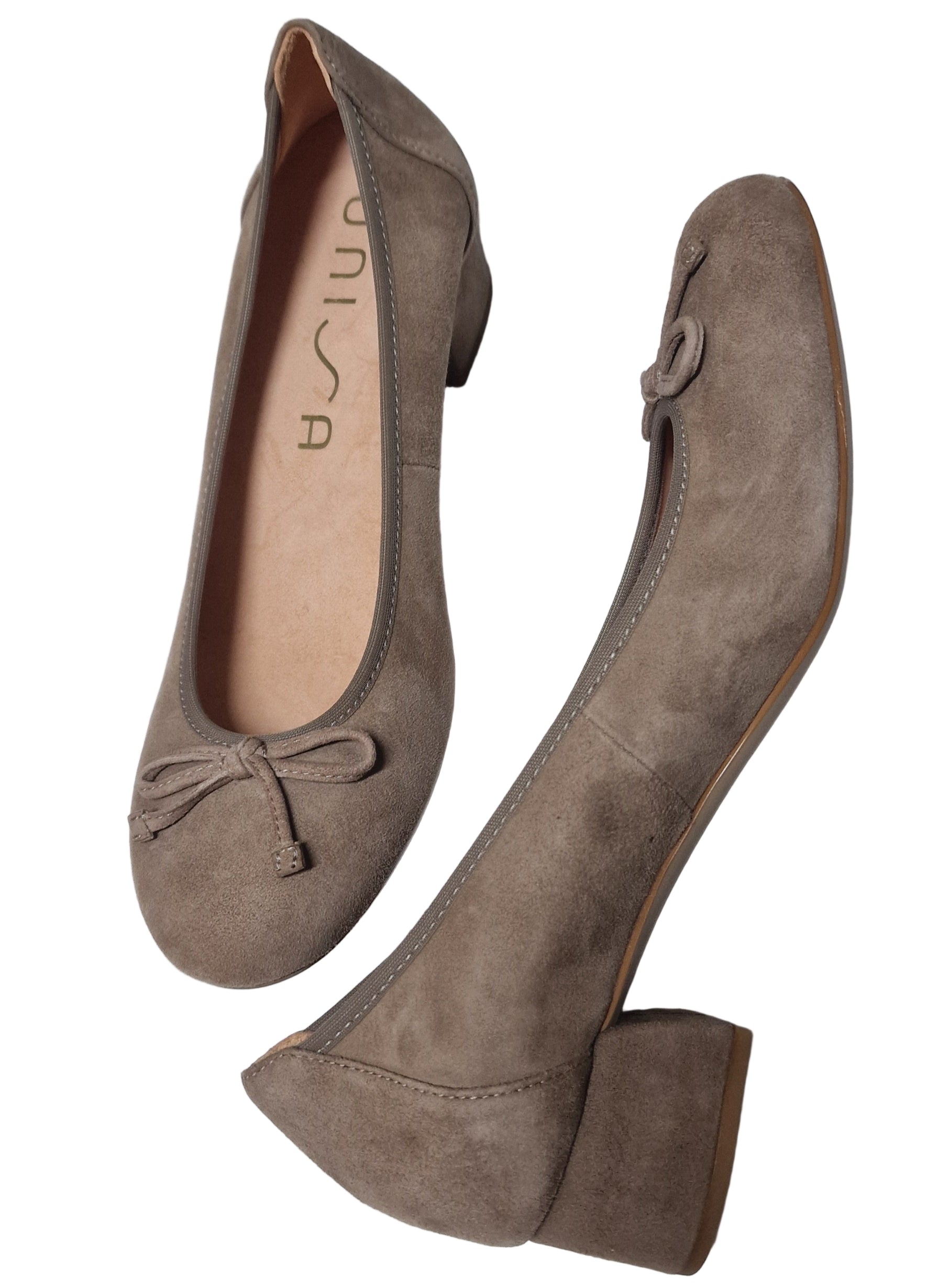 Sabrina com tacão baixo em camurça cor funghi. Com palmilha conforto e rebordo elastisado. Marca Unisa. Sola borracha para maior conforto.